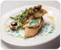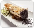 [23] Torrada de llom amb formatge i llit de ceba, ou de guatlla i caramel de vi