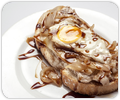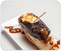 [27] Albergínia farcida de botifarró amb ceba caramel·litzada i ou de guatlla